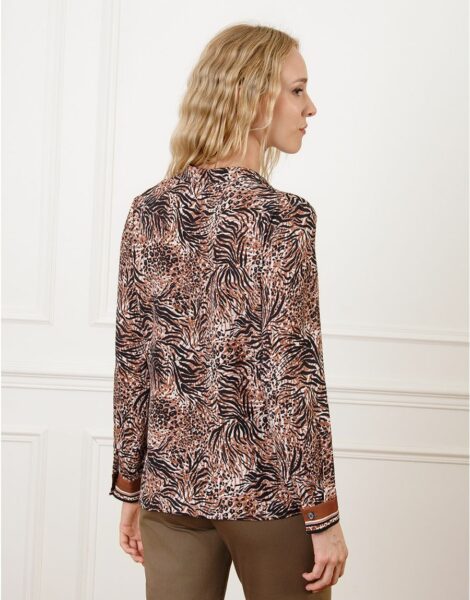 Blouse marron motif animalier – Coupe droite – Col chemisier – Encolure en V avec boutons – Manches longues – Tissu doux et fluide