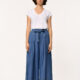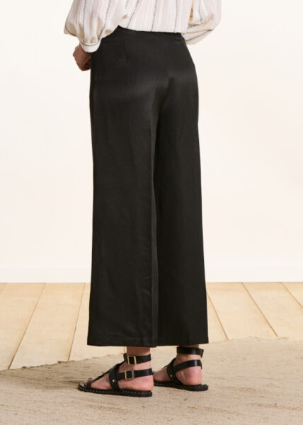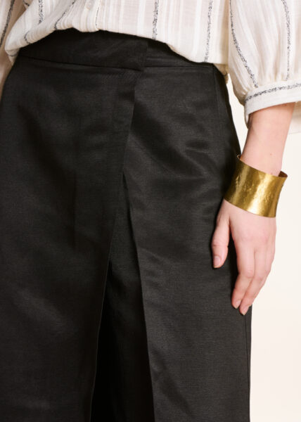 PANTALON TISSU LEGEREMENT BRILLANT AVEC UN PAN QUI SE CROISE SUR LE DEVANT, LONGUEUR 7/8EME , JAMBES TRES LARGES, TAILLE HAUTE, ZIP INVISIBLE DANS COUTURE COTE.