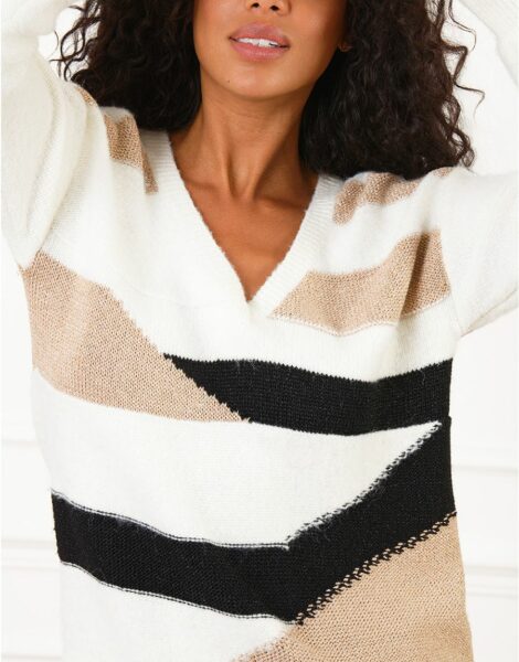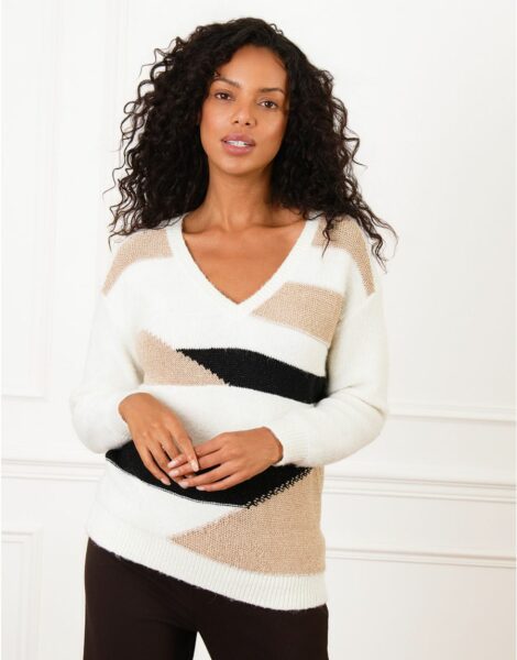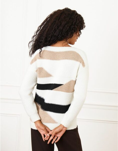 Pull patch écru à grosse maille – Coupe légèrement ample – Encolure en V – Manches longues – Touches de doré – Maille douce et chaude