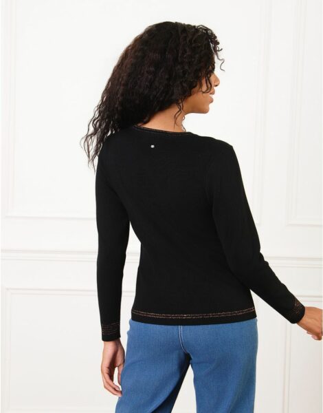 Pull noir maille fine tricot fantaisie – Coupe droite – Encolure ronde – Manches longues – Détails : motif brodé et rayures avec fils métallisés cuivrés