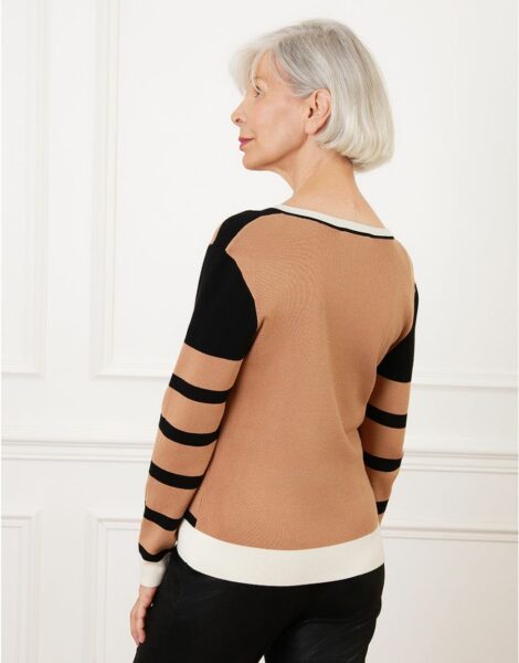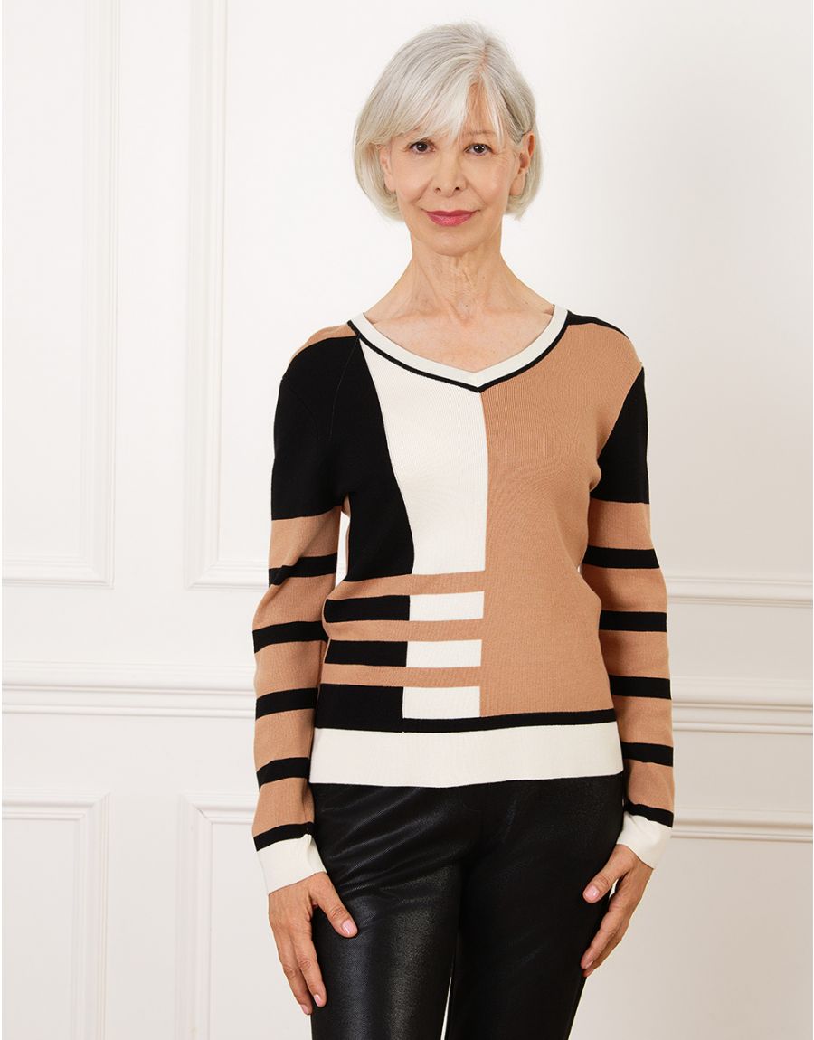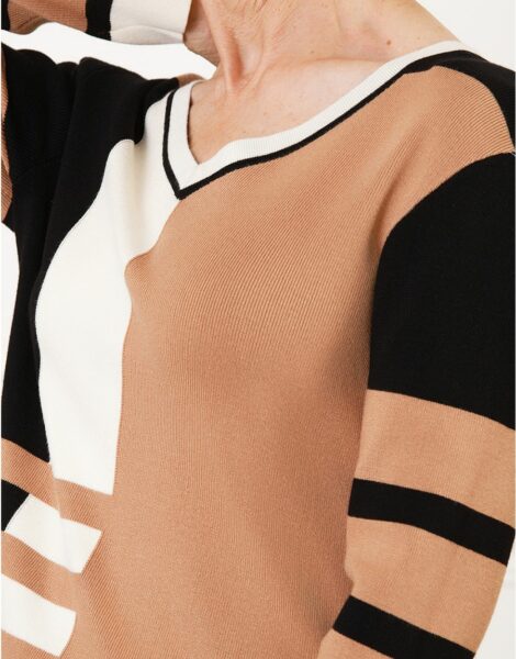 Pull color block noir et camel – Coupe droite – Encolure en V – Manches longues – Maille douce et fine