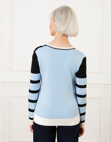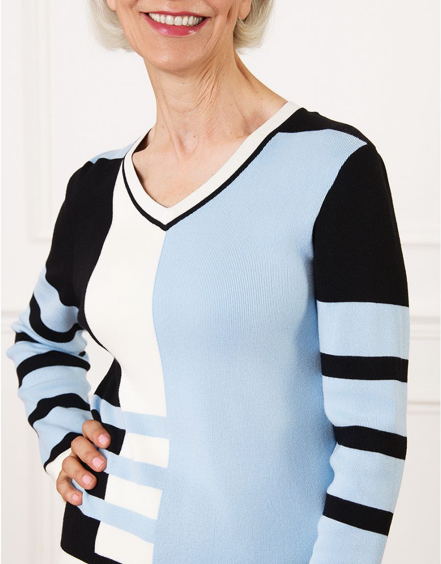 Pull maille fine color block bleu clair – Coupe droite – Encolure en V – Manches longues – Maille douce