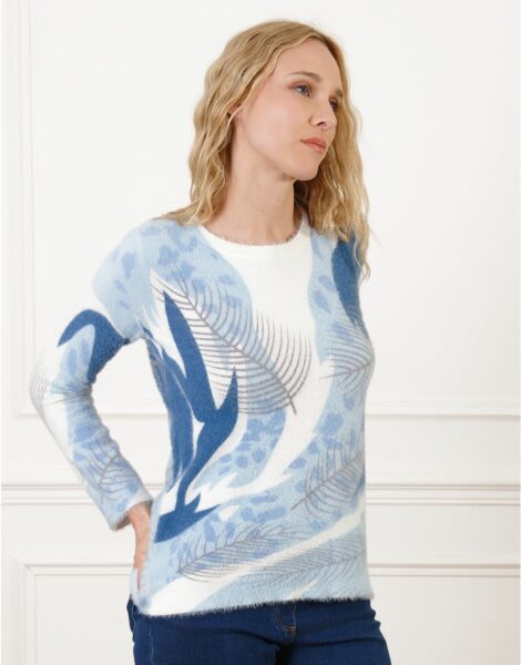 Pull duveteux bleu clair à motif – Coupe droite – Encolure ronde – Manches longues – Maille douce
