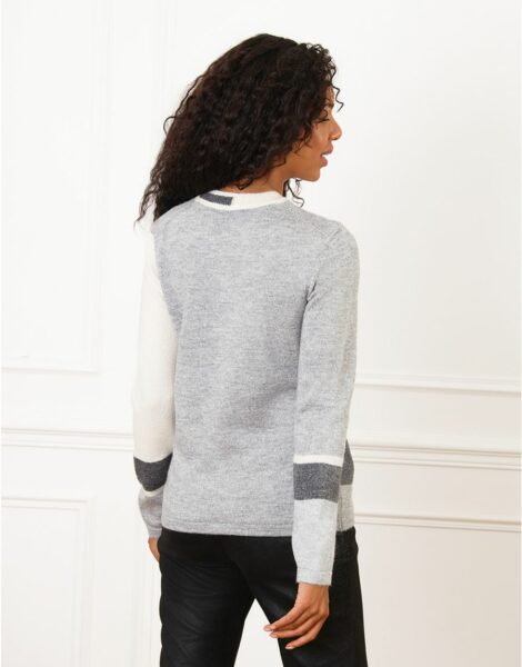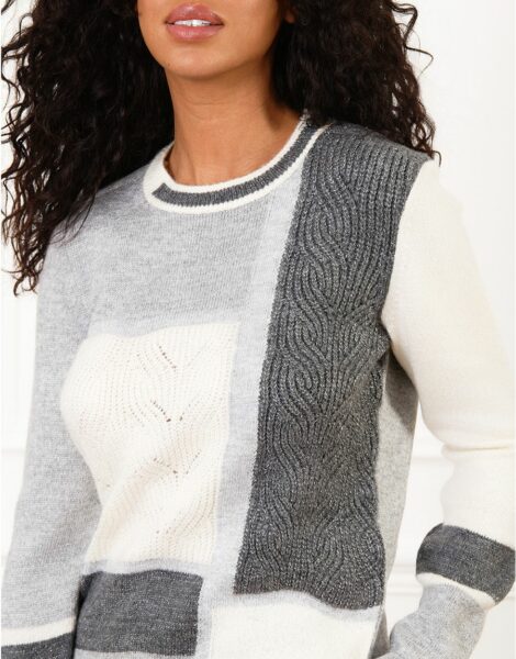 Pull patch à maille fantaisie gris – Coupe droite – Encolure ronde – Manches longues – Fils métallisés – Maille douce