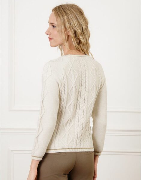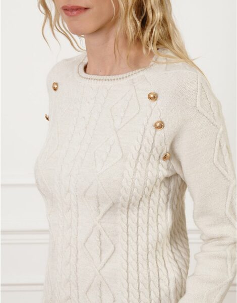 Pull écru tricot fantaisie – Coupe droite – Encolure ronde – Manches longues – Boutons stylisés sur le devant – Touches de doré