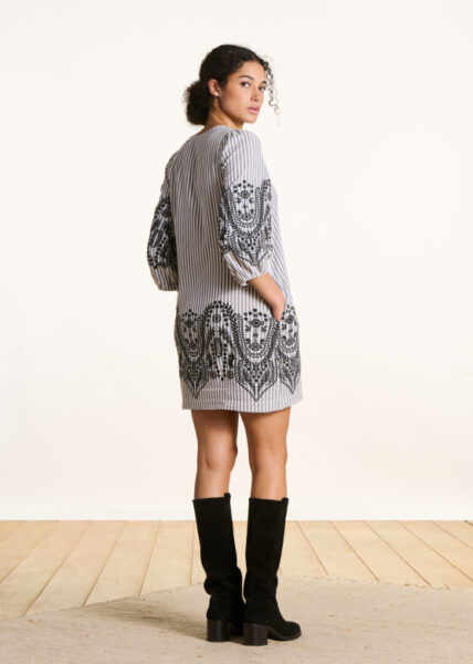 ROBE COURTE RAYEE AVEC MOTIF JACQUARD, COL TUNISIEN, MANCHES AU COUDE AVEC FINITION ELASTIQUEES
