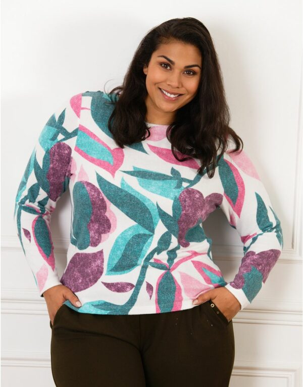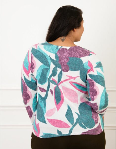 T-shirt chaud écru motif fleurs – Coupe droite – Encolure ronde – Manches longues – Boutons sur la couture épaule – Maille douce