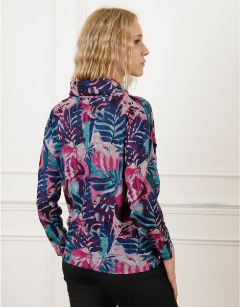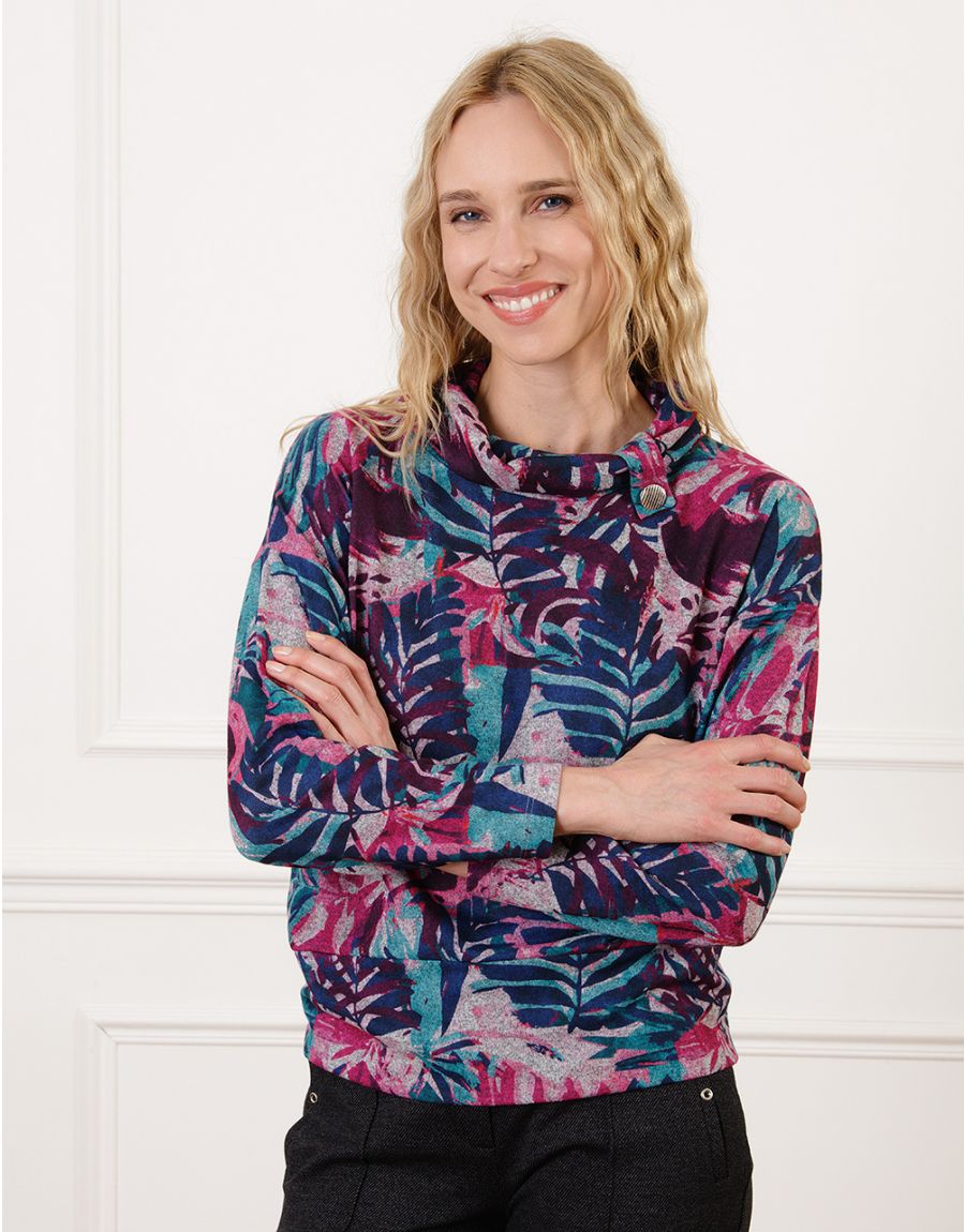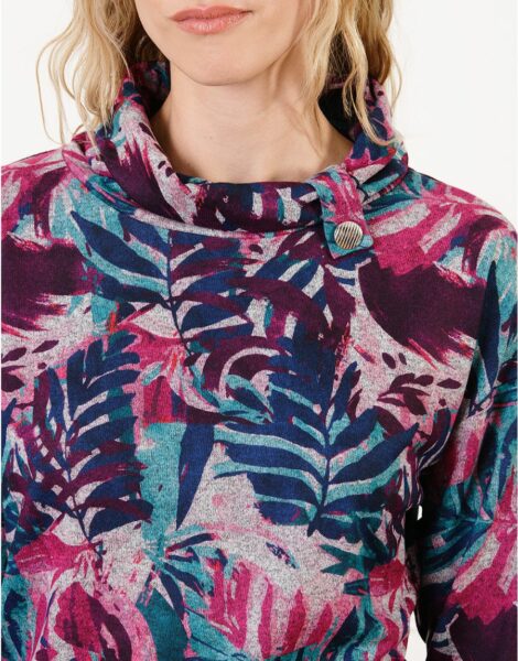 T-shirt chaud multicolore motif tropical – Coupe légèrement ample – Col boule avec détail bouton stylisé – Manches longues – Resserré sur le bas
